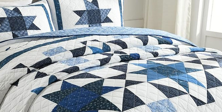 The wide variety of blue shades just makes the room pop, love the quilt! Especially like the extra width, hard to get a quilt that fits my king bed properly. Well made and very cozy without being too warm.